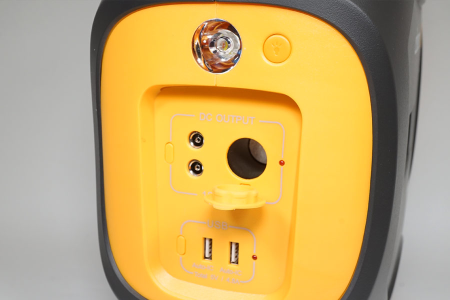 本モデルには、さまざまな機器を充電できるように、豊富な出力端子が搭載されています。具体的には、DCポート、シガーソケット、USB、家庭用コンセントです。また、このデカい本体に充電するのに要する時間は約7時間となっています。