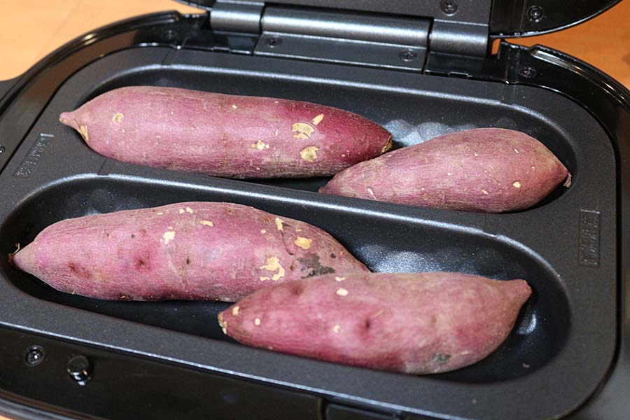 洗った安納芋を本体にセット。小さめなので、1ホールに対して2つ入れます