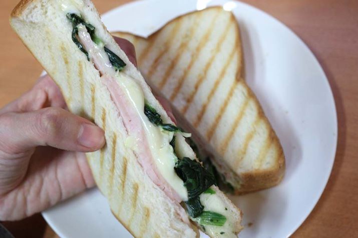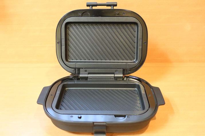 せっかくなので、平面プレートに付け替えてホットサンドを作ってみました。「耳までしっかりプレスして中の具がもれない」というタイプのホットサンドではありませんが、1度に2食分調理可能。ホットサンド以外に肉や魚を焼いたり、パイシートを使って簡単にアップルパイを作ることもできます。