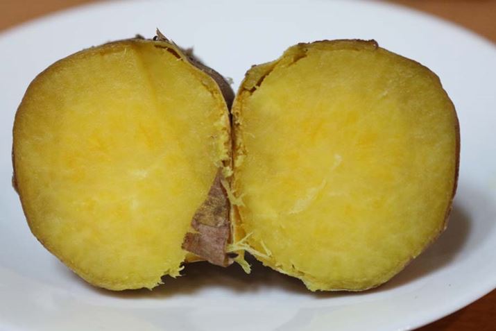「WFS-100」で焼いた安納芋。しっかり熱が通っていますが、皮と実の間に隙間は生まれていません。素材のおいしさを100%生かすためには、あと1歩加熱が足りなかったかもしれません。皮がやわらかく、ちょっとふかし芋に近い仕上がりです