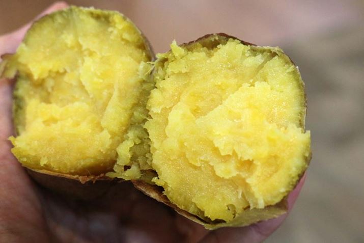 水分を多く含み、焼くとねっとりとしたクリームのような食感になる安納芋をお取り寄せ。生の状態でも16度前後と非常に糖度が高く、じっくりと時間をかけて焼けば糖度が40度前後にもなるそう