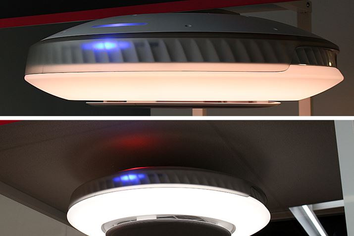 空気清浄機能をオンにすると、正面に青いランプが点灯します。また、天面には空気の汚れを光の色で知らせる「きれいモニター」を搭載。見えづらいように感じますが、天井面に反射した光の色で状態を判断できる仕様となっています