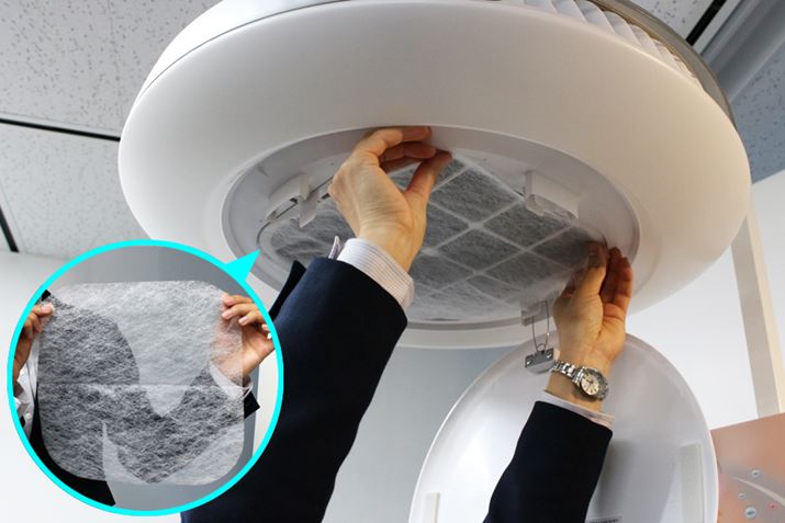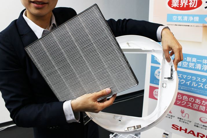 構造を簡単に説明すると、空気清浄機能(フィルターとファン、プラズマクラスターイオン発生ユニット)を組み込んだLEDシーリングライトとなります。簡単に製品化できるように思われるかもしれませんが、天井に付けるものだけに安全性などの基準をクリアするのは非常に大変だったとのこと。安全を担保しつつ、高い空気清浄性能と照明性能を両立するのに構想6年、開発2年という長い年月がかかったそうです。