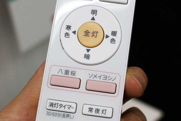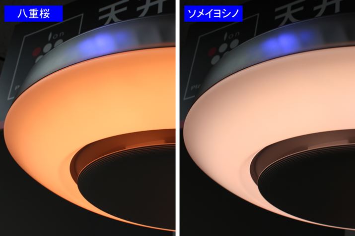 「八重桜」「ソメイヨシノ」はLEDシーリングライトのカバー部を見るとキツイ色に見えますが、実際に照らされた光色は非常にやさしいもの
