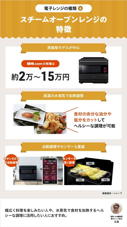 「スチームオーブンレンジ」は、水蒸気を使った加熱調理が特徴。10万円を超える高額なモデルなどがラインアップされています。