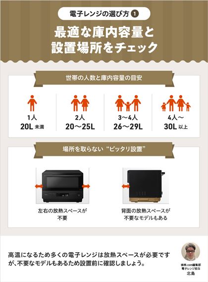 ここでは、使用する家族の人数や、調理方法、温めの精度を左右するセンサー、お手入れのしやすさなどを中心に、電子レンジの選び方のポイントを紹介します。