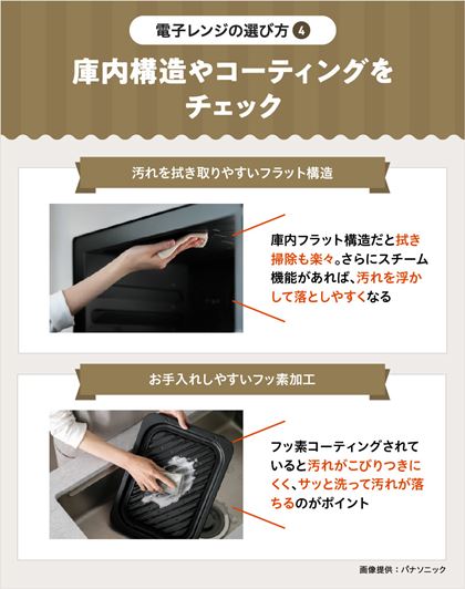 電子レンジを選ぶ際は、庫内構造にも注目。電子レンジは日々使用するものなので、庫内が食材の油などで汚れることがよくあります。汚れを放置しておくと臭いの元になったりするので、手軽にお手入れできる構造や機能を搭載したモデルを選びましょう。