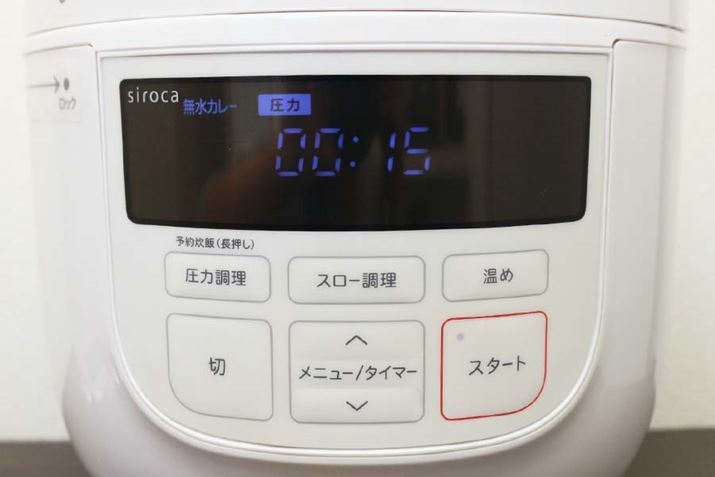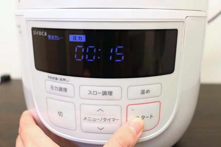 「メニュー/タイマー」ボタンで「無水カレー」を選び、「スタート」ボタンを押すだけ。プリセットされた「加熱→加圧(15分)→保温(15分)」という工程が自動で行われます