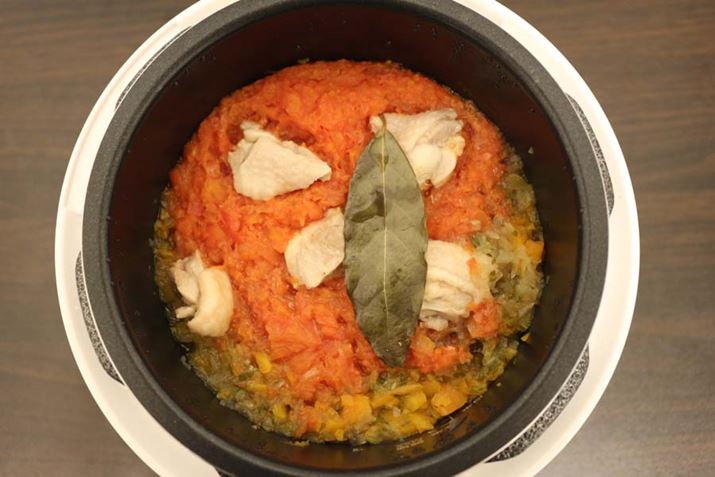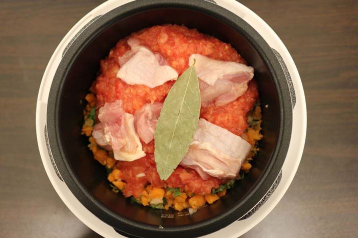みじん切りにした野菜と鶏肉、ローレルを入れた内なべを本体にセット。みじん切りにはフードプロセッサーを使用したので、下準備は10分ほどで終了しました。なお、カレーやシチューのルウなどの粘り気のあるものを入れて圧力調理をすると、ふたのノズルが詰まって故障の原因になるので、ルウは必ず後入れです!