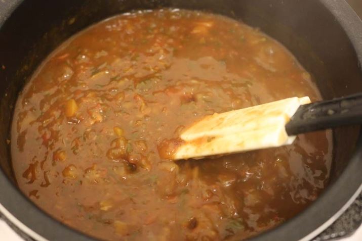 具の加圧調理が終了した段階では、こんな感じ。まだおいしそうではありませんが、1時間足らずで野菜がクッタリとして水分もしっかり出ています。スタートから減圧完了まで45分ほどでした