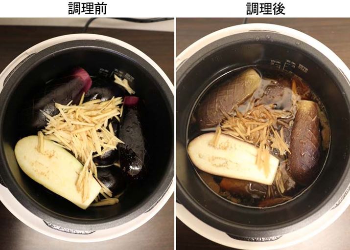 なすとしょうが、調味液を内なべに入れ、「圧力調理」ボタンを押して加圧時間を10秒にセット。こちらもレシピの3倍の量を作りました。内なべの「調理MAX」線ぎりぎりでしたが、問題なく完成。スタートから減圧完了まで30分ほどでした