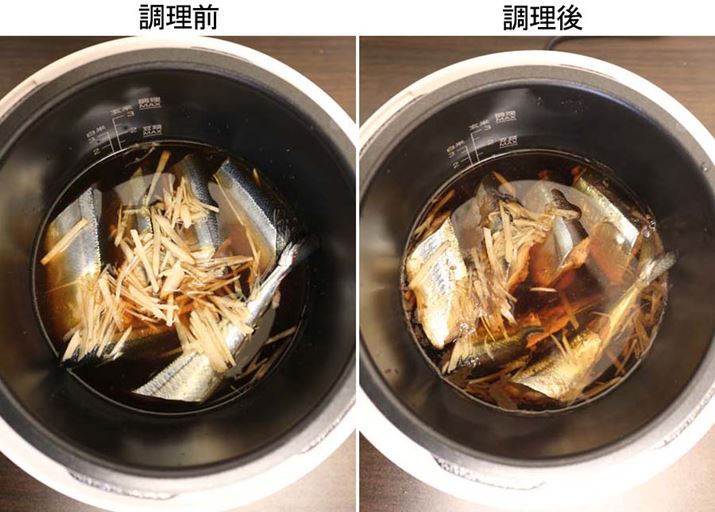 さんまとしょうが、調味液を内なべに入れ、「メニュー/タイマー」ボタンで「さんま煮」を選び、「スタート」ボタンを押すだけ。スタートから減圧完了まで40分ほどでした