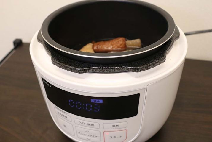 ちなみに、レシピブックには加熱時間や加圧時間の記載がありますが、「SP-D131」の圧力調理では「加熱→加圧→保温→減圧」という工程で調理を行うため、加圧時間以外に、加熱(3〜20分)、保温(メニューごとに設定された時間)、減圧(5〜30分)の時間がそれぞれかかります。レシピに書かれている加圧時間に加え、前後に少し時間がかかることを覚えておきましょう。