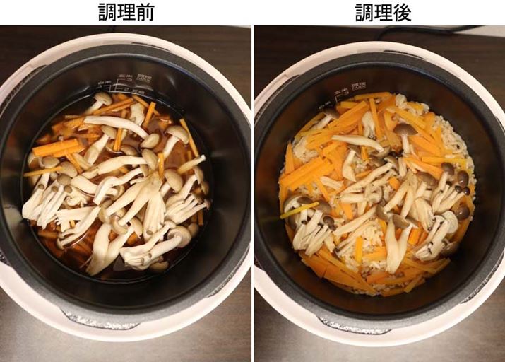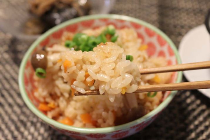 炊き込みご飯をひと口。高級炊飯器や土鍋で炊いたような、ふっくらもちもちで米の甘みがー! という味ではありませんが、芯が残ることもなく、普通においしい。25分ほどでこのクオリティの炊き上がりなら文句はありません。急いでいる時は炊飯モードを重宝しそうです