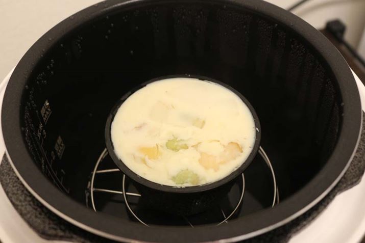 炊き込みご飯だけでは寂しいので、蒸し機能を使ってチルドの茶碗蒸しを蒸してみました。直径9cmの茶碗蒸しの場合、1度に入れられるのはひとつ。加圧時間45秒で蒸し上がります。スタートから減圧完了まで10分強でした
