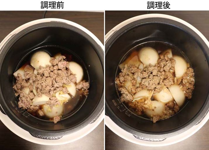 火曜日はいつも帰宅が遅いため、前の晩、寝る前に「スロー調理」モードでおでんを仕込んでおきました。「スロー調理」は、約85℃で沸騰させずに加熱することで、煮崩れせずに食材をやわらかく仕上げるモード。調理終了後、自動的に保温の状態になり、最大6時間保温します。