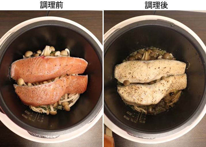 鮭ときのこ、たまねぎ、調味液を加圧時間3分で調理。野菜がクタクタになっています。スタートから減圧完了まで大体15分でした