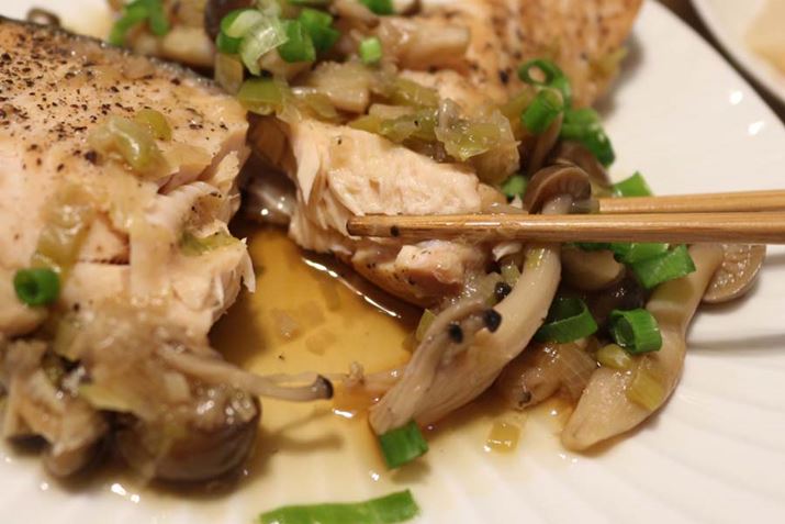 調理のネタも尽きてきた金曜日、初日に感動を与えてくれた「無水調理」で、鮭ときのこの無水煮を作ってみました。