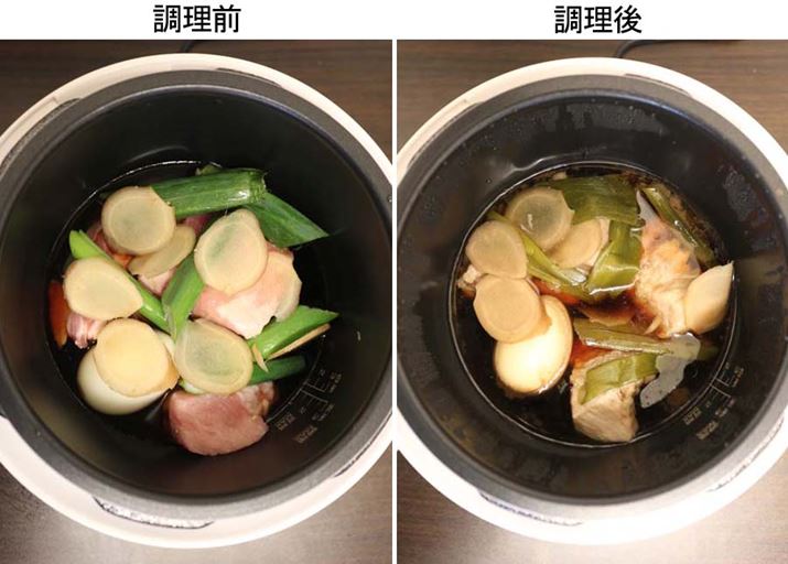 豚肉の仕上がりはどちらもこんな感じ。脂の部分はとろとろなのですが、肉はそれほどやわらかくなっておらず(肉が悪い?)、箸で割ることはできませんでした。味のしみ方ももう1歩だったので、圧力調理にしてもスロー調理にしても、加減を見ながら時間を延ばすといいかもしれません