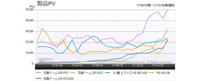そんな伝統的な国内メーカーが強い「電子レンジ・オーブンレンジ」カテゴリーであるが、2017年の12月時点で人気の製品は図3の通りとなっている。直近では、東芝の「石窯ドーム ER-PD7」と「東芝 石窯ドーム ER-RD7」が大きく人気を伸ばしているが、この2モデルはそれぞれ2016年発売、2017年発売の、新旧モデル。2万円台で購入できるお手頃な価格ながら、スチーム調理にも対応する機能性の高さが魅力だ。これに続く第3位につけているのは、同じく東芝の上位モデル「石窯ドーム ER-RD3000」。300℃の高温出力が可能なオーブン機能を持ち、2段調理も行える高機能製品ながら、こちらも5万円台というお手頃さで人気を得ている。
