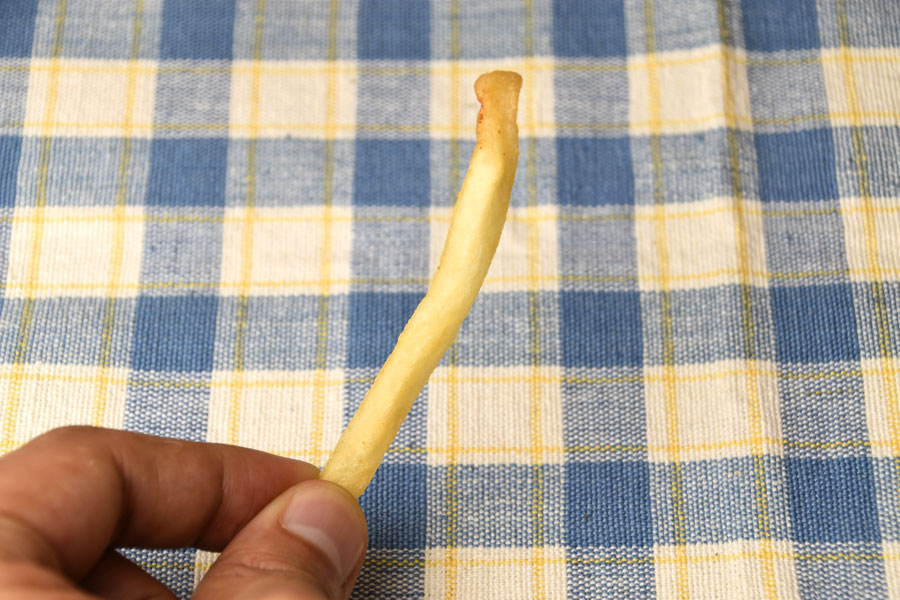 まず、マクドナルドのベストセラー「マックフライポテト」からスタート。アメリカ産のじゃがいもを使っている同メニューは、でき立てでは外はカリッと、中はホクホクな味わいが特徴だが、冷めるとカリッと感はゼロになる。