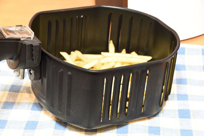 ポテトを入れたバスケットとバスケットパンを本体にセット。温度を調節して、タイマーをセットすれば調理がスタートする。温め直しの場合は、150℃で調理時間10分以内を目安にセットする