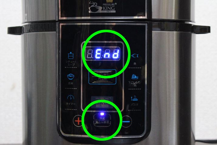 調理が終了するとディスプレイに「End」の文字が表示され、下側の「保温/煮込み調理」のランプが点灯し、自動で保温モードになります。ここまでで、余熱の時間も含めると、大体20〜25分です