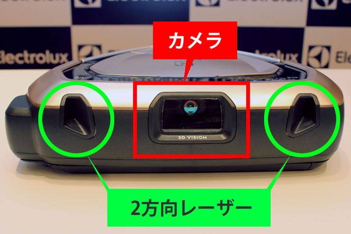 PUREi9の1番の特徴は、エレクトロラックスが独自開発した3Dマッピング機能「3D Visionテクノロジー」を採用すること。本体前面に搭載する「2方向レーザー」と「カメラ」を使い、室内の環境を360°方向で立体的に検知するシステムです。自分のいる位置も含めて把握します。