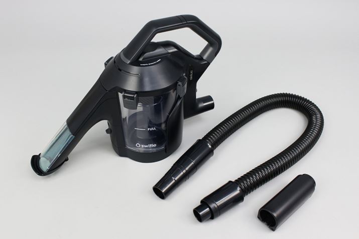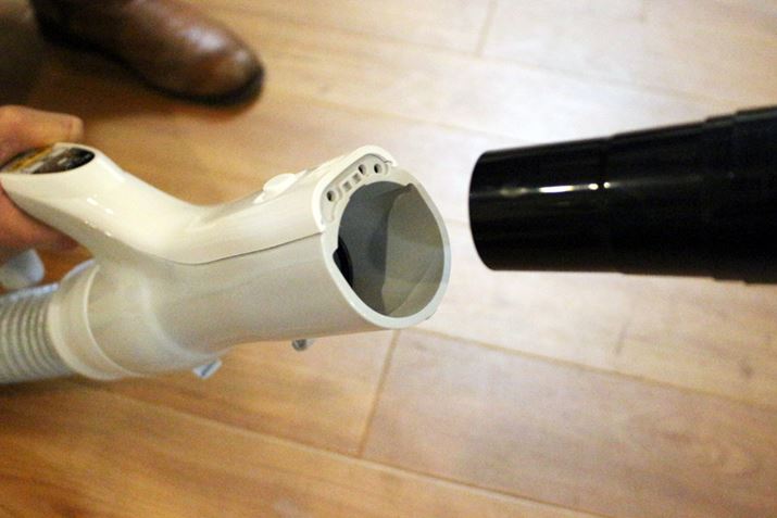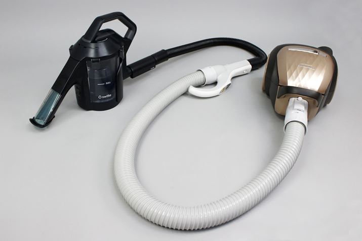 スイトルに水を入れたら、掃除機と接続します。今回、スイトルと接続したのは、パナソニックのキャニスター型紙パック式掃除機「MC-PK18G」(吸込仕事率600W)。掃除機の吸込仕事率が高いほうがスイトルの洗浄能力も高くなるそうです