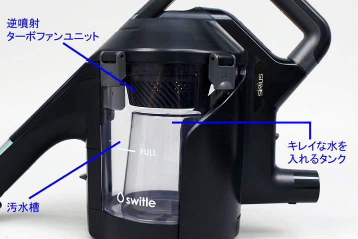 冒頭でスイトルのことを“水掃除機”と紹介しましたが、正確には、普通のキャニスター型掃除機を水掃除機に変身させる「掃除機用水洗いクリーナーヘッド」です。筆者は液体を吸引する掃除機だと思っていたのですが、水掃除機は“水のチカラを利用して汚れを落とす”ものなのだそう。そのため、使用時にはスイトルに水をセットしなければなりません。水を入れたスイトルを掃除機に接続し、掃除機の運転をオンにするとノズルからキレイな水が噴射されると同時に吸引も行われます。吸い込まれた液体は、スイトルに搭載されたファンで遠心分離され、液体だけがスイトルに溜まり、掃除機には空気のみ送られるので、掃除機に液体が入ることはありません。また、スイトルには水の噴射を止めて吸引運転のみにするモードも用意されているので、仕上げにこのモードを行うと渇きやすくなります。