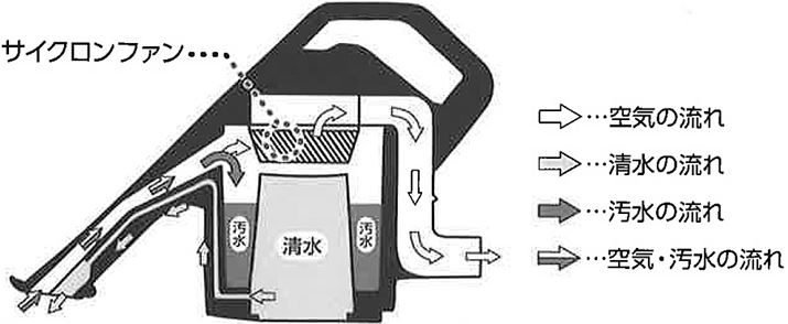 掃除機の吸引を利用してファンが回転し、ノズルから吸い込んだ液体を汚れた水と空気に遠心力で分離。汚れた水は汚水槽に溜まり、掃除機には空気しか送られないようになっています