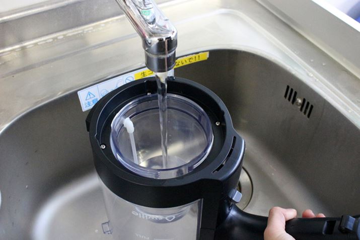 運転を始めるとノズルから勢いよく水が噴射されるとともに、コーヒーが吸引されていきます(下の動画参照)。ノズルの外に水は漏れないので汚れは広がらず、上手にできているな……と感心しました。