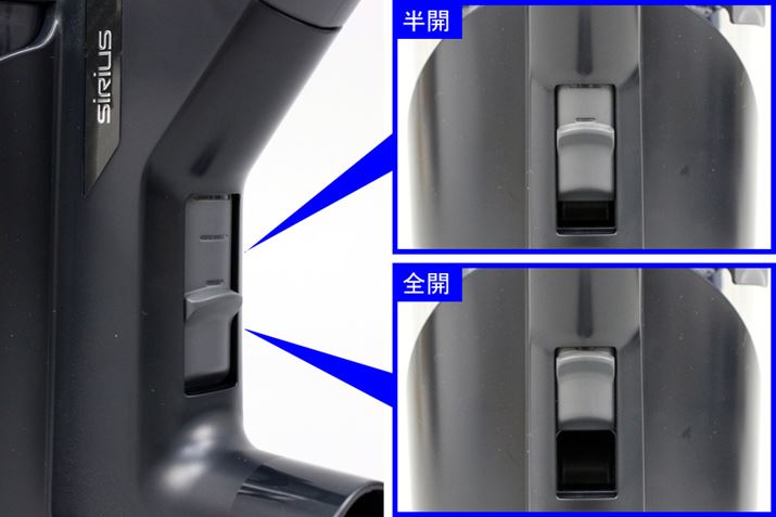 なお、掃除機の性能(吸込仕事率)にあわせて吸込力を調節するレバーがスイトルに用意されています。「全閉」「半開」「全開」の3段階から選べますが、通常は全閉状態でOK。運転中に吸込力がダウンする時などには開け方を変え、掃除機の運転モードを「最強」にするなどして調整するそうです