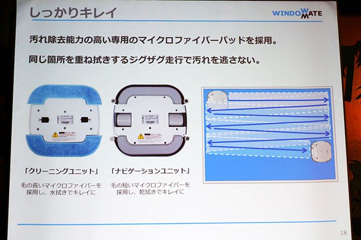 掃除は窓の最上部まで走行したのち端まで移動することで、窓のサイズを計測。その後は、下に向けて左右ジグザグに掃除していきます