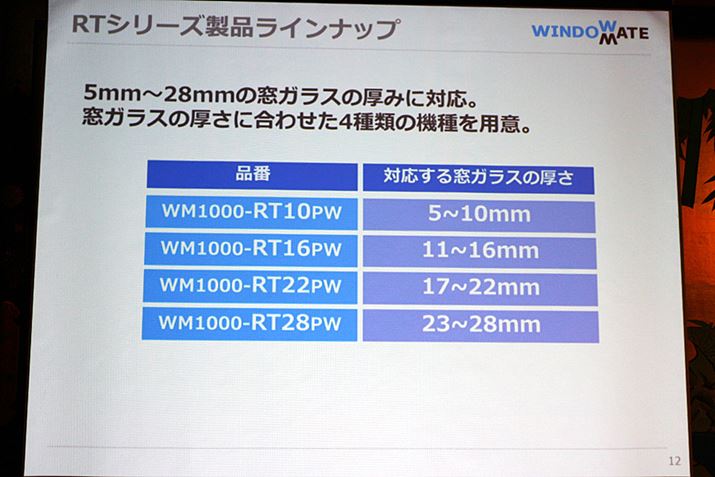 窓ガラスの厚みにあわせて4機種をラインアップ。一般的にシングルガラスは5〜10mm、ペアガラスは11〜16mmとなるようです。市場想定価格は5〜10mm厚用の「WM1000-RT10PW」と11〜16mm厚用の「WM1000-RT16PW」が64,800円、17〜22mm厚用の「WM1000-RT22PW」と23〜28mm厚用の「WM1000-RT28PW」が69,800円(いずれも税別)