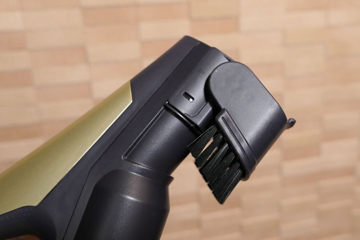 持ち手部分には、折りたたんだ「ベンリブラシ」をセットできます。これは階段の巾木(はばき)の掃除や、棚の掃除などに便利。いちいち付属品を付け替えなくても、「ベンリブラシ」を起こすだけでいいので手間がかかりません。