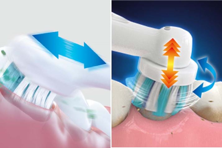 音波振動によってブラシを左右(または上下、もしくはその両方)に高速振動させる音波振動式(左)と、ブラシを左右に回転させる回転式(右)