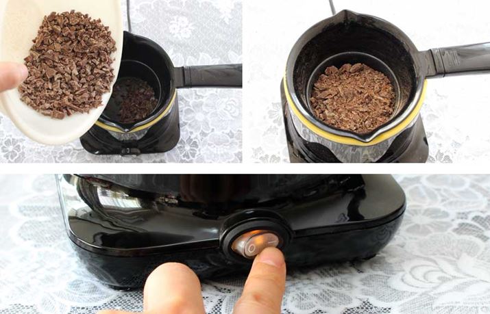 まずはチョコレートを細かく砕いてポットに入れ、本体の電源を入れます。電源ONにすると、自動で加熱がスタートする仕組み