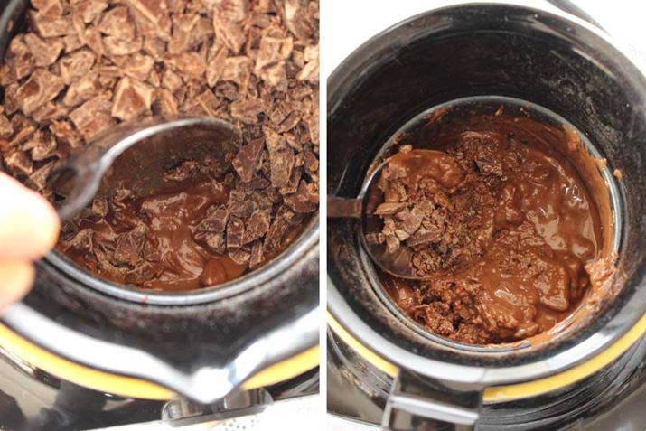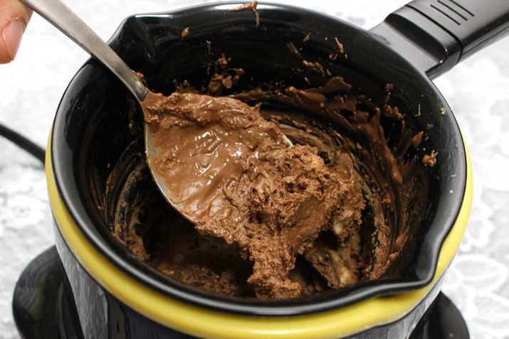 フッ素樹脂加工のポットが熱を効率よくチョコレートに伝え、スイッチONから1分も経つと徐々にチョコが溶けてきます。ゆっくり混ぜながら加熱していきましょう