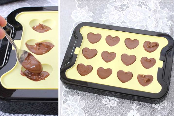 溶かしたチョコレートをシリコンモールドに入れ、冷蔵庫で固めます。溶かしたチョコレートは粘度があるので、スプーンで少しずつすくいながらモールドに入れて、最後にトレイごとテーブルにトントンとあててならすと、型にうまく入ります