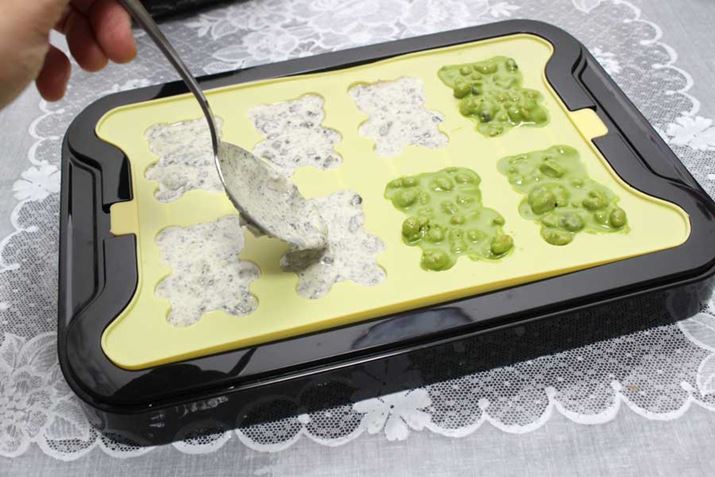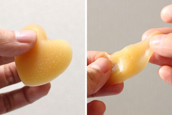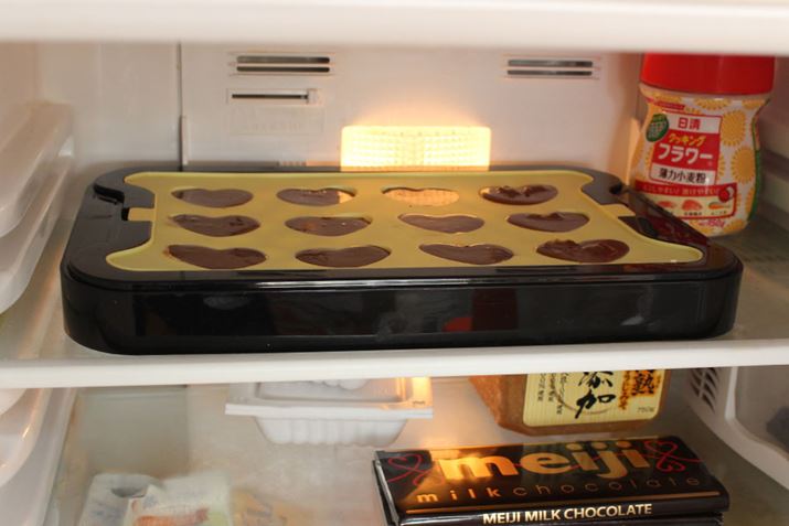 ゼラチンが入っているので、冷蔵庫に入れなくても、ある程度冷めるとすぐに固まります。グミは触っても溶けないので、モールドから取り出すのもチョコレート以上に楽チン