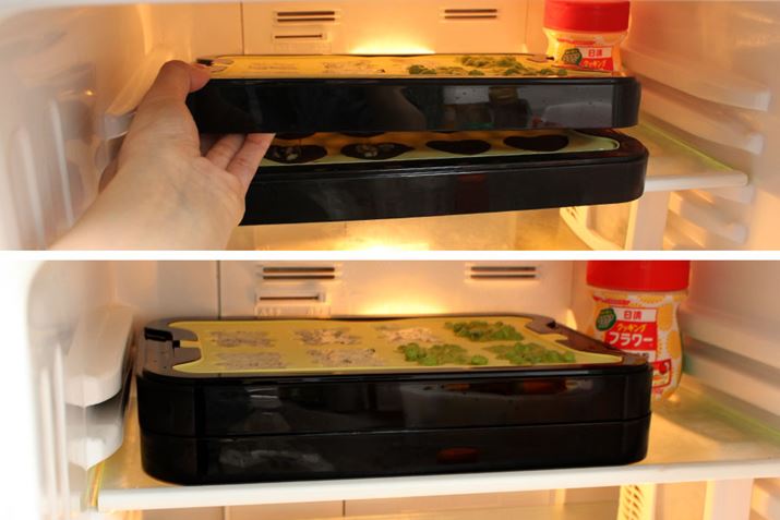 モールドを乗せるトレイは、上下に重ねることができます。冷蔵庫に入れておきやすい省スペース設計がうれしい