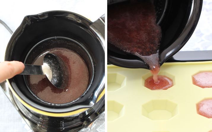 ゼラチンと水を混ぜたら、ジャムとレモン汁を加えて混ぜながら加熱するだけ。ポットからそのままモールドに注ぐことができます