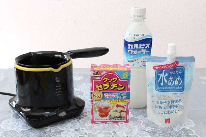 こちらも水とゼラチンを混ぜたら、カルピスウォーターと水あめを入れて混ぜながら加熱するだけ。よく混ざったらモールドに流しいれて冷蔵庫へ