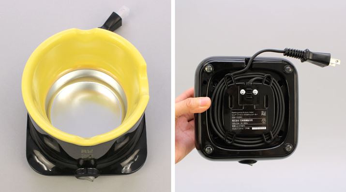 コンパクトなヒーターに専用ポット(片手鍋)をセットして使います。ヒーターはフロント部に、電源ON/OFFスイッチのみを備えるシンプル仕様