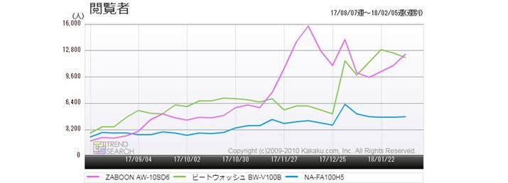 図5は、日立、東芝、パナソニック3社における、洗濯容量10kgの縦型洗濯機・主要モデルのアクセス推移を示したものだ。これを見ると、昨年2017年9月時点では、この3モデルの間に大きな人気の差はなかった。しかし、まず11月くらいから、東芝「ZABOON AW-10SD6」の人気が急上昇し、その後12月後半に、日立「ビートウオッシュ BW-V100B」の人気が急上昇した。この2モデルは、年明け以降も高い人気を維持しており、実際、売れ筋ランキングの上位にも顔を出しているが(図4)、パナソニック「NA-FA100H5」に関しては、この2モデルほどの人気の伸びにはなっておらず、現時点では結果として大きな差が付いている。