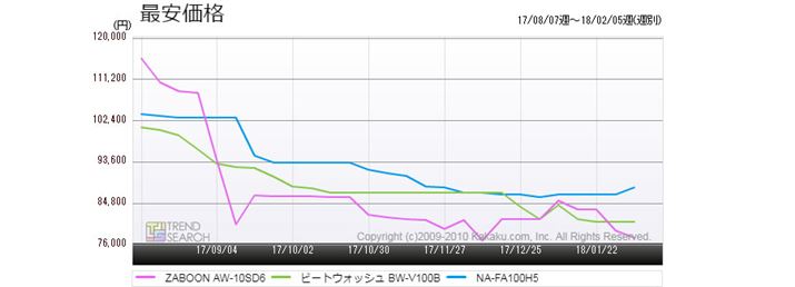 この人気推移の裏には、販売価格が大きく影響している。図6は、上記3モデルの同時期における最安価格推移を示したものだが、まずは東芝「ZABOON AW-10SD6」が、2017年9月に大きく最安価格を下げ、一気に85,000円のレベルに突入している。ライバルとなる2モデルとはこの時点で1万円近い価格差が出ており、これが同モデルの人気を牽引したものと思われる。これに続くように最安価格が下がったのは、日立「ビートウオッシュ BW-V100B」。10万円前後の価格帯から徐々に下げ、85,000円レベルでいったんは落ち着いたが、その後、年末近くに東芝「ZABOON AW-10SD6」と同等レベルの価格にまで下げており、8万円を切るレベルにまで下がっている。この動きは、上記図5の動きとほぼシンクロしているのがわかるだろう。これに対して、パナソニック「NA-FA100H5」の最安価格は、年末に85,000円レベルまでいったん下げたものの、その後むしろ上昇に転じており、2018年2月14日時点の最安価格は93,999円と、かなり上がっている。ライバル2モデルに比べて、1万円以上の価格差が開いており、これが人気を押し下げた形だ。なお、東芝「ZABOON AW-10SD6」の現時点の最安価格は76,300円で、3モデルの中ではもっとも安い。