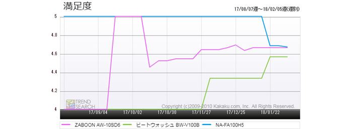 もちろん、人気の理由は価格だけではない。この3モデルのユーザー満足度の推移も見ておこう。図7を見ると、各モデルとも動きは異なるが、現時点でのユーザー満足度はほぼ同じようなレベルでそろってきている。2018年2月14日時点の各モデルのユーザー満足度だが、一番高いのは日立「ビートウオッシュ BW-V100B」の4.76(評価者:4名)、続いてパナソニック「NA-FA100H5」の4.67(評価者:3名)、一番下が東芝「ZABOON AW-10SD6」(評価者:12名)の4.52となっている。評価者の数も異なるため、実質的にはほぼ同じくらいの満足度と言ってよさそうだ。同じくらいの性能であれば、相対的に安い製品のほうに人気が出るのは、自然な流れだろう。