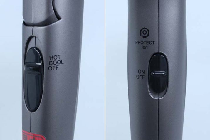 ハンドル部の前面のスイッチで風温を、背面のスイッチでイオンのオン/オフを切り替えます。風温は、80℃(HOT-風量最大使用時)〜107℃(HOT-風量最小〜中使用時)
