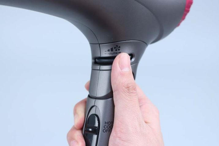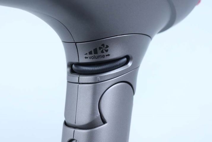 風量の調節がシームレスに行えるエアボリュームダイヤルは、ハンドルの付け根に配置されているので、髪の毛を乾かしながらでも無理なく操作可能。最少風量は1.0m3/分です